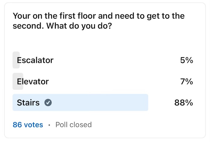 OK, either a whole bunch of you are lying or I didn’t properly frame the question, ‘cause when I’m at the airport and there is an escalator right next to a set of stairs, 95% of people take the escalator. So fess up.