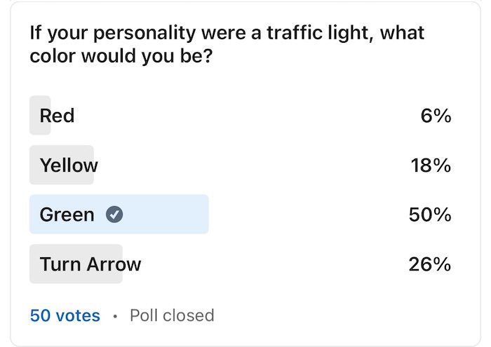 » If your personality were a traffic light, you’d most likely be… GREEN (50%)