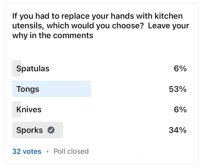 » If your hands were kitchen utensils, they’d be… TONGS (53%)
